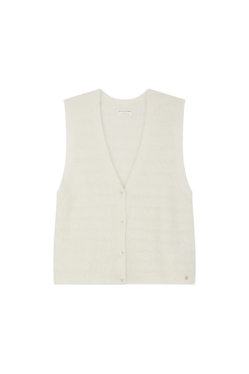 La tendance rétro continue son ascension et s’installe dans notre dressing d’hiver avec ce gilet sans manches Bernie en alpaga superfine. Coupe droite pour un look boyfriend, portez-le ouvert ou fermé sur une chemise longue pour une silhouette contemporaine. • Gilet sans manches en alpaga superfine • Encolure V boutonnée • D devantétails ajourés • Finitions en bord-côte • Robe pull réalisée dans un nouveau fil italien du groupe « Mousseux » composé d’Alpaga Superfine du Pérou pour sa texture moelleuse et chaude et de polyamide recyclé ajoutant de l’élasticité • Coloris Crème : un blanc crème • Modèle dessiné à Paris par notre styliste • Fabriqué en Italie • Longueur : 53 cm pour une taille 1 • Jolien mesure 1m76 et porte une taille 1 • Conseil style : portez-le avec une chemise et la jupe longue Siara
