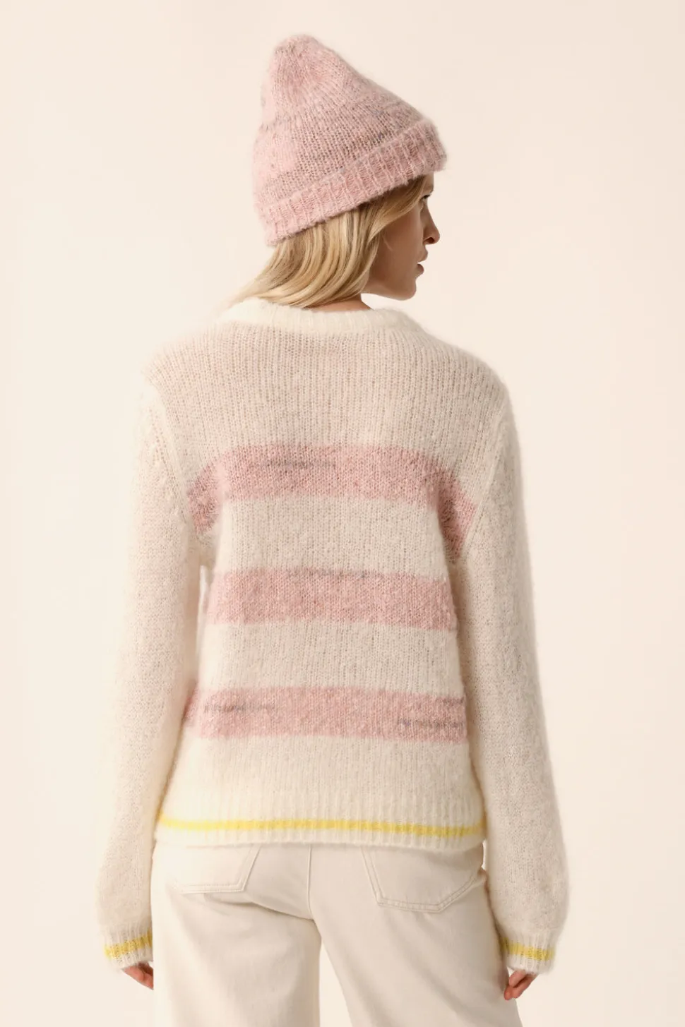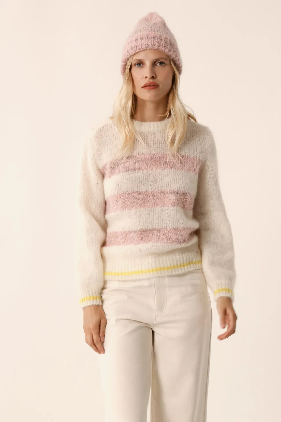 Coupe droite, col rond et très doux, le pull Alba opte pour un look marinière moderne et coloré. Porté avec un pantalon ou une jupe, on aime ses fines rayures jaune pop. • Pull droit à rayures • Manches longues • Finitions en bord-côte • Pull col rond femme réalisé dans avec deux fils italiens du groupe « Moelleux fantaisie » composé de Kid Mohair d’Afrique du Sud et laine mérinos de fermes d’Afrique du Sud et d’Argentine garantissant le bien être animal et certifiéé sans Mulesing. Le fil est gonflant, chaud, très doux et duveteux. • Coloris Écru et Brume Poudre : un blanc écru et rose poudré • Modèle dessiné à Paris par notre styliste • Fabriqué en Italie • Longueur : 55 cm pour une taille 1 • Jolien mesure 1m76 et porte une taille 1 • Conseil style : portez-le avec un jean large et des mocassins pour un look citadin