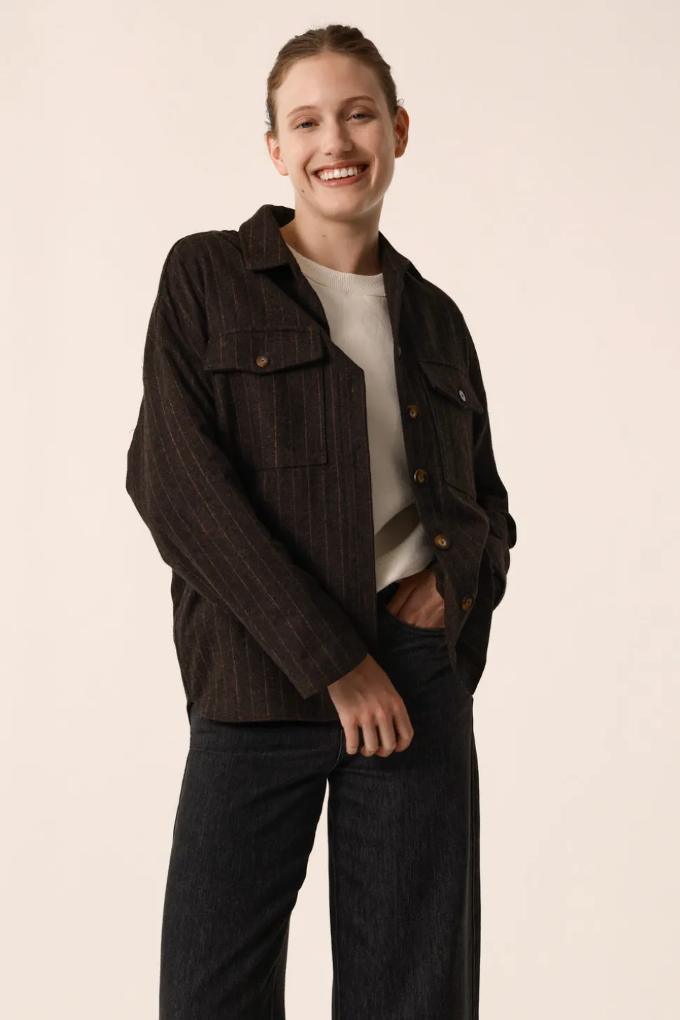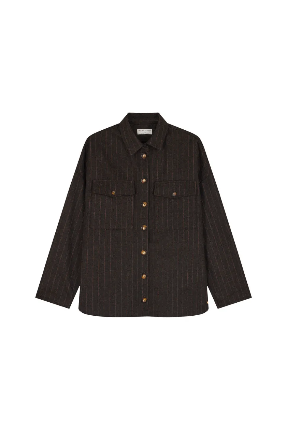 Must have du vestiaire d’automne, attention risque élévé d’addiction mode pour la surchemise Sabina. Pièce effortless qu’on aime retrouver chaque saison, elle gagne en chaleur et en style avec sa laine et ses rayures fines. • Surchemise à rayures • Col chemisier • Poches plaquées à rabat sur poitrine • Poignets boutonnés • Ouverture boutonnée • Surchemise chaude en laine italienne • Rayure exclusive Des Petits Hauts « Asali » : de fines rayures brun chaud sur un fond gris anthracite • Modèle dessiné à Paris par notre styliste • Longueur : 70,5 cm pour une taille 1 • Josie mesure 1m77 et porte une taille 1 • Conseil style : optez pour une silhouette ultra contemporaine en l’associant à un t-shirt à message et le pantalon cargo assorti Sable