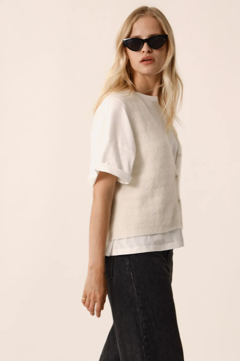 La tendance rétro continue son ascension et s’installe dans notre dressing d’hiver avec ce gilet sans manches Bernie en alpaga superfine. Coupe droite pour un look boyfriend, portez-le ouvert ou fermé sur une chemise longue pour une silhouette contemporaine. • Gilet sans manches en alpaga superfine • Encolure V boutonnée • D devantétails ajourés • Finitions en bord-côte • Robe pull réalisée dans un nouveau fil italien du groupe « Mousseux » composé d’Alpaga Superfine du Pérou pour sa texture moelleuse et chaude et de polyamide recyclé ajoutant de l’élasticité • Coloris Crème : un blanc crème • Modèle dessiné à Paris par notre styliste • Fabriqué en Italie • Longueur : 53 cm pour une taille 1 • Jolien mesure 1m76 et porte une taille 1 • Conseil style : portez-le avec une chemise et la jupe longue Siara