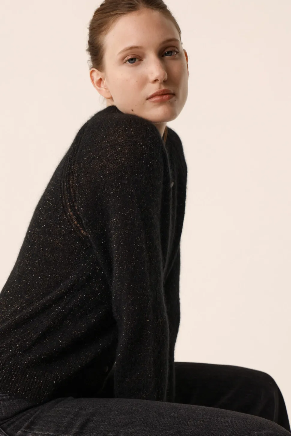 Le gilet col rond Blizar rejoint la liste des indispensables de l’hiver. En kid mohair et soie d’une grande douceur, ce modèle à l’élégante simplicité s’accordera facilement à un jean ou une jupe longue. • Gilet col rond boutonné • Emmanchures raglan à détails ajourés • Finitions en bord-côte • Gilet réalisé en fil du groupe « Silky » composé de Kid Mohair d’Afrique du Sud et de soie de Chine. La beauté de ce fil réside dans sa finesse et son extrême douceur.| Coloris Noir : un noir intemporel • Modèle dessiné à Paris par notre styliste • Longueur : 53,5 cm pour une taille 1 • Jolien mesure 1m76 et porte une taille 1 • Conseil style : portez-le avec le pantalon évasé Loumo et les boots Paloupa pour un look chic décontracté