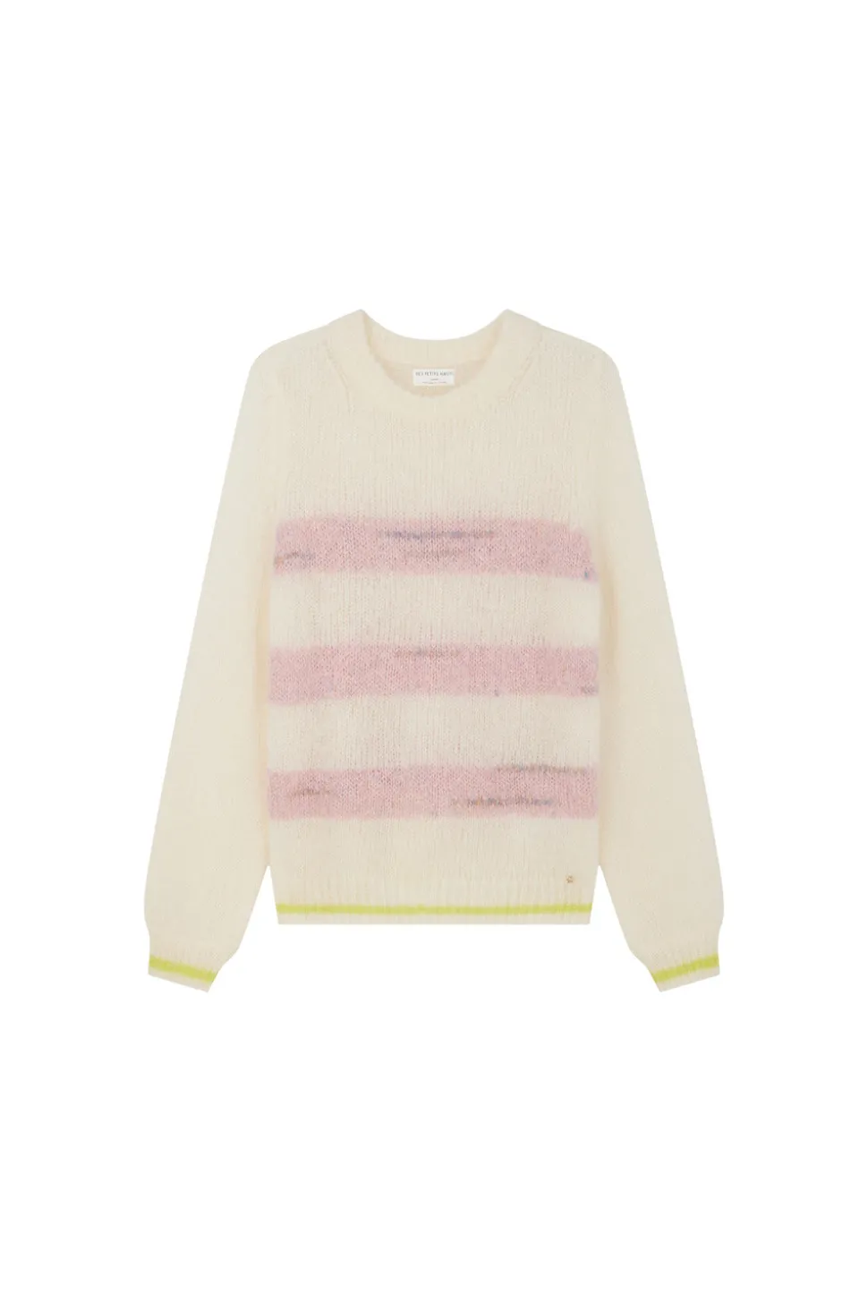 Coupe droite, col rond et très doux, le pull Alba opte pour un look marinière moderne et coloré. Porté avec un pantalon ou une jupe, on aime ses fines rayures jaune pop. • Pull droit à rayures • Manches longues • Finitions en bord-côte • Pull col rond femme réalisé dans avec deux fils italiens du groupe « Moelleux fantaisie » composé de Kid Mohair d’Afrique du Sud et laine mérinos de fermes d’Afrique du Sud et d’Argentine garantissant le bien être animal et certifiéé sans Mulesing. Le fil est gonflant, chaud, très doux et duveteux. • Coloris Écru et Brume Poudre : un blanc écru et rose poudré • Modèle dessiné à Paris par notre styliste • Fabriqué en Italie • Longueur : 55 cm pour une taille 1 • Jolien mesure 1m76 et porte une taille 1 • Conseil style : portez-le avec un jean large et des mocassins pour un look citadin