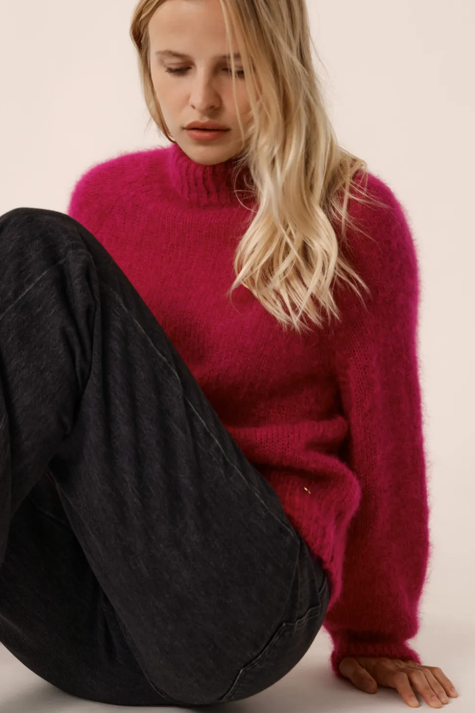 Volume généreux, manches raglan, le pull col montant Chachou en kid mohair promet un hiver cosy chic et minimaliste. Proposé dans une palette de couleurs naturelles et plus vives, cet intemporel séduit pour sa versatilité. • Pull volume généreux col montant • Manches bouffantes • Emmanchures raglan • Finitions en bord-côte • Pull réalisé dans un nouveau fil italien du groupe « Fluffy » en kid mohair d’Afrique du Sud et laine mérinos extrafine d’Australie certifié RMS & RWS. Fil au toucher très doux, gonflant et duveteux. • Coloris Lupin : un rose fuchsia • Modèle dessiné à Paris par notre styliste • Longueur : 57 cm pour une taille 1 • Jolien mesure 1m76 et porte une taille 1 • Conseil style : portez-le avec le pantalon Rostille et le blazer coordonné pour un look boyish élégant